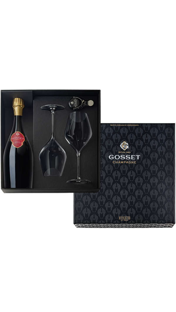 Eco-designed and handcrafted in Épernay, this new reusable box contains a bottle of Gosset Grande Réserve, two Champagne tasting glasses, and a stopper specially adapted to the unique, iconic shape of the Gosset Champagne bottles.